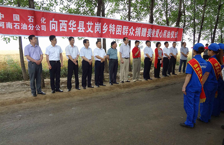 這次捐贈(zèng)活動(dòng)為西華縣艾崗鄉(xiāng)半截樓村群眾免費(fèi)送來(lái)了10噸柴油,平均每臺(tái)收割機(jī)50升。這也是省委宣傳部聯(lián)合中石化河南石油分公司連續(xù)5年開(kāi)展這項(xiàng)活動(dòng)。5年來(lái),為駐村群眾免費(fèi)送油共計(jì)50噸。在活動(dòng)現(xiàn)場(chǎng),中石化的加油車(chē)為十幾臺(tái)收割機(jī)免費(fèi)加了“愛(ài)心油”,并送給村民每人一個(gè)裝有汗衫、毛巾和手套的“愛(ài)心禮包”,有效地解決了困難群眾最關(guān)心、最急需的麥?zhǔn)沼糜蛦?wèn)題,服務(wù)群眾、支援三夏走完最后一公里。三夏志愿服務(wù)隊(duì)員莊嚴(yán)承諾,為顆粒歸倉(cāng)、豐產(chǎn)豐收提供最便利、最高效的服務(wù)。劉國(guó)明副巡視員在致辭詞中轉(zhuǎn)達(dá)了部領(lǐng)導(dǎo)對(duì)駐村幫扶點(diǎn)半截樓村群眾的問(wèn)候,對(duì)中石化河南石油分公司履行國(guó)企職責(zé),積極開(kāi)展“石油惠農(nóng)服務(wù)優(yōu),支援三夏促豐收”扶貧濟(jì)困的愛(ài)心行動(dòng)表示贊賞和感謝。劉國(guó)明副視員要求駐村工作隊(duì),三夏期間繼續(xù)加大幫扶力度,對(duì)因病致貧、致寡家庭、軍烈屬、外出務(wù)工農(nóng)戶,組織青年志愿者無(wú)償幫扶收麥。呼吁社會(huì)各界樹(shù)立公益愛(ài)心理念,傳遞社會(huì)正能量,積極開(kāi)展城市反哺農(nóng)村,企業(yè)支持農(nóng)業(yè),市民關(guān)愛(ài)農(nóng)民等活動(dòng),為早日建成美麗鄉(xiāng)村助一臂之力。(駐村工作隊(duì))